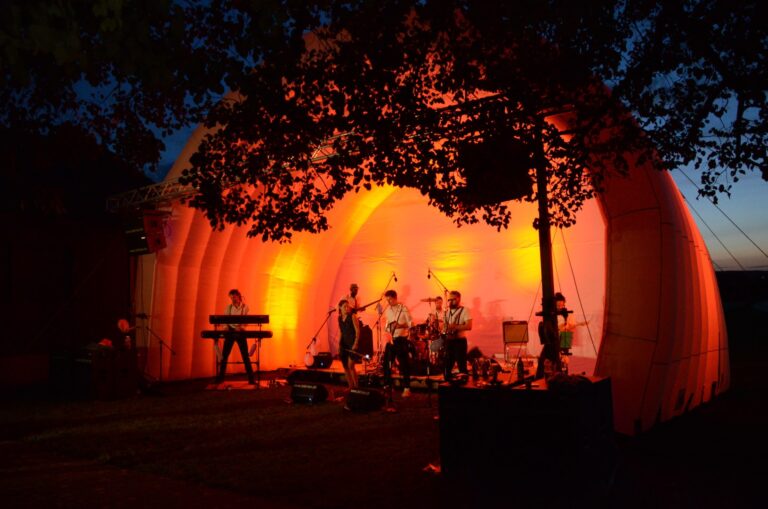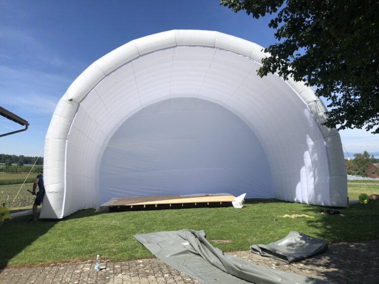 Unsere aufblasbaren Konzertüberdachungen (sog. Bühnenzelte) bieten Musikern, Künstlern und Rednern eine Allwetterbühne. Wir bieten folgende Größen an: